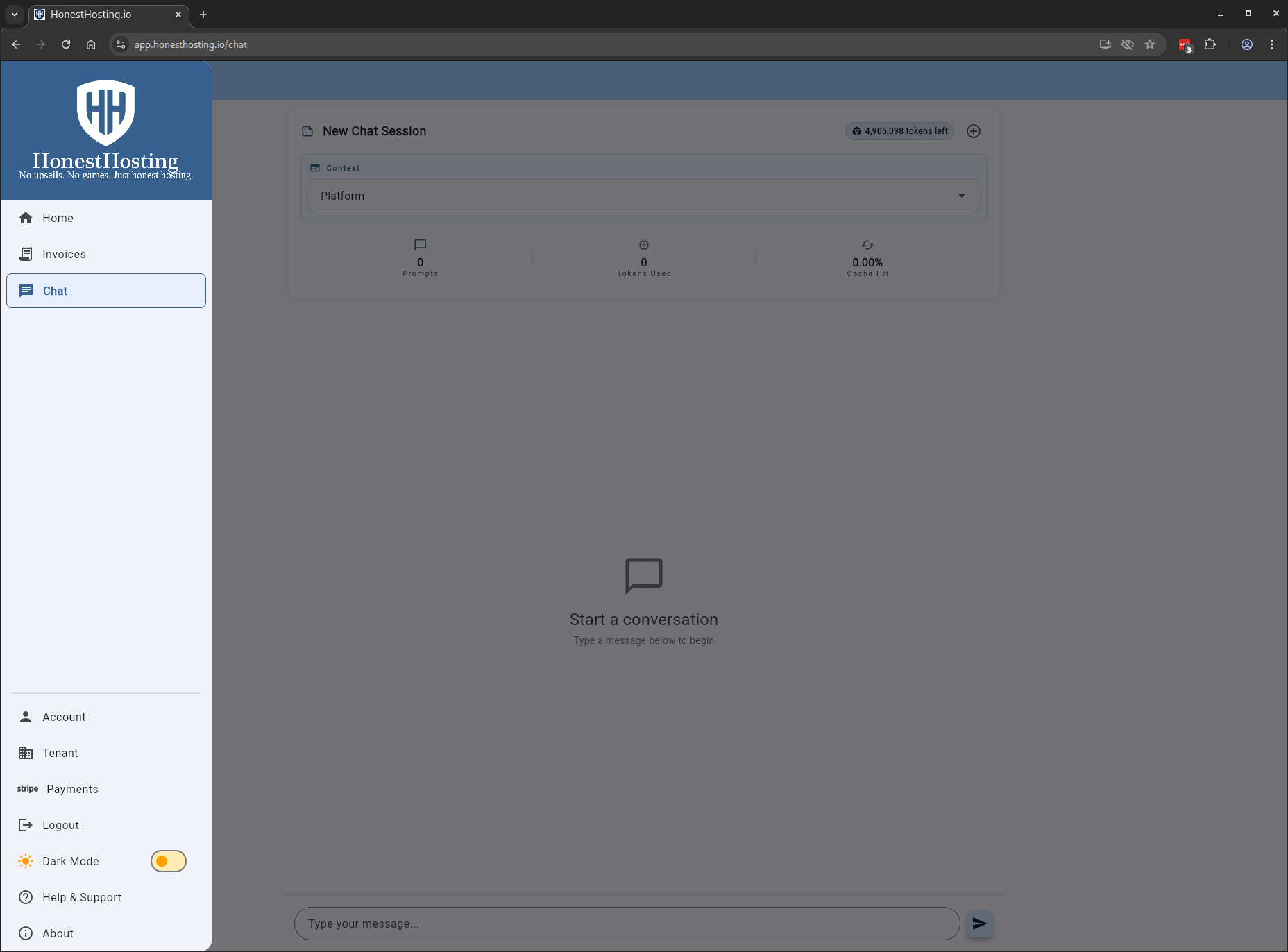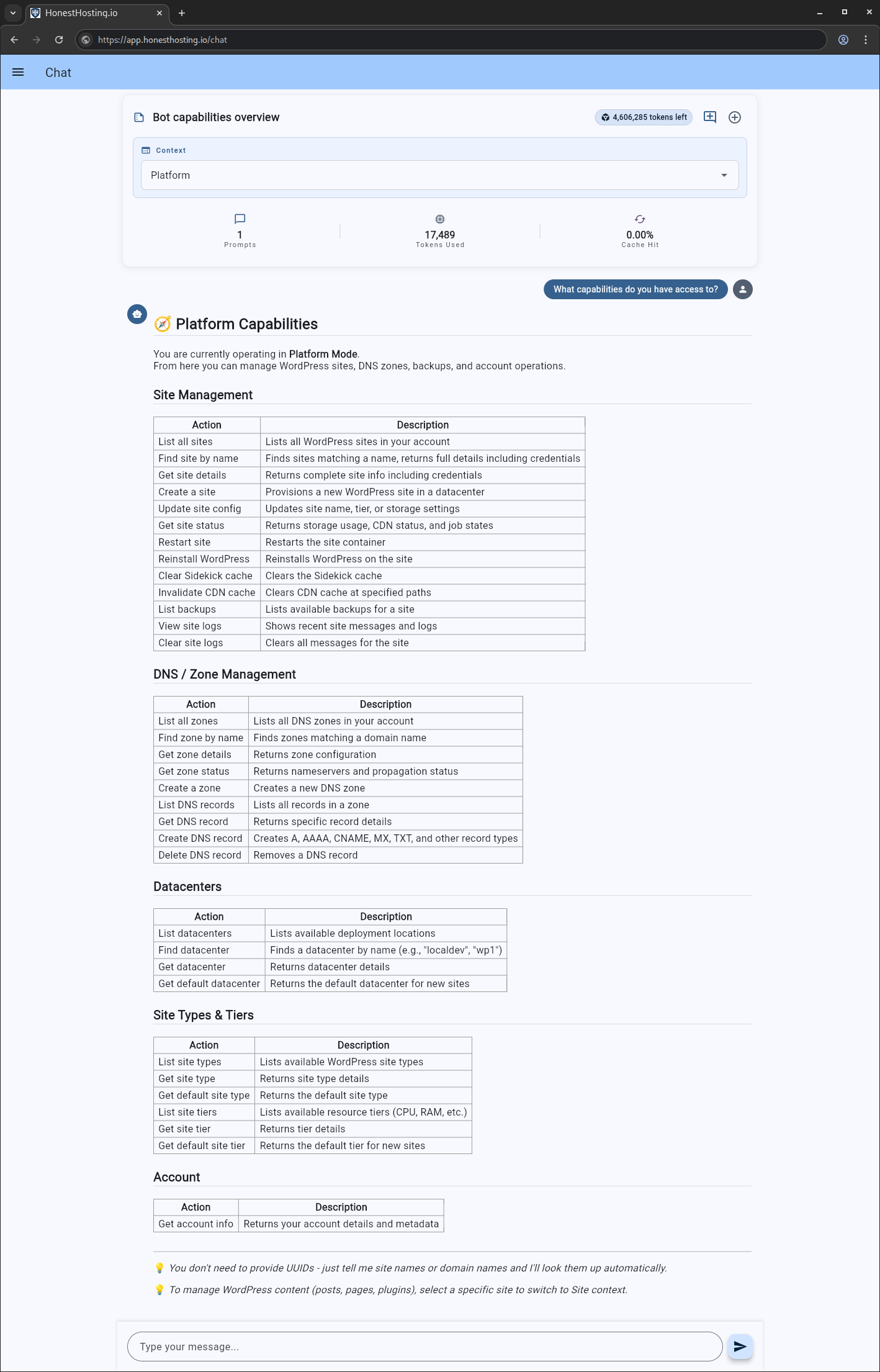 The platform context allows you to perform basic operations in the context of the HonstHosting.io platform. For example, select the Platform context, and ask
