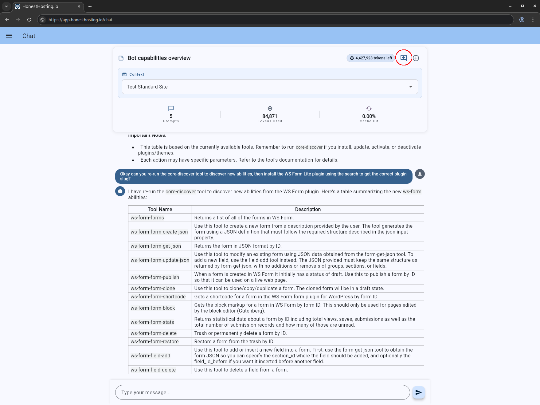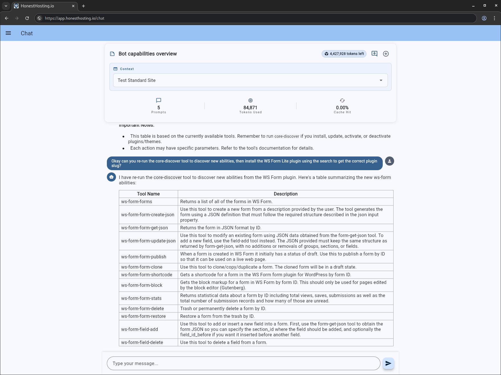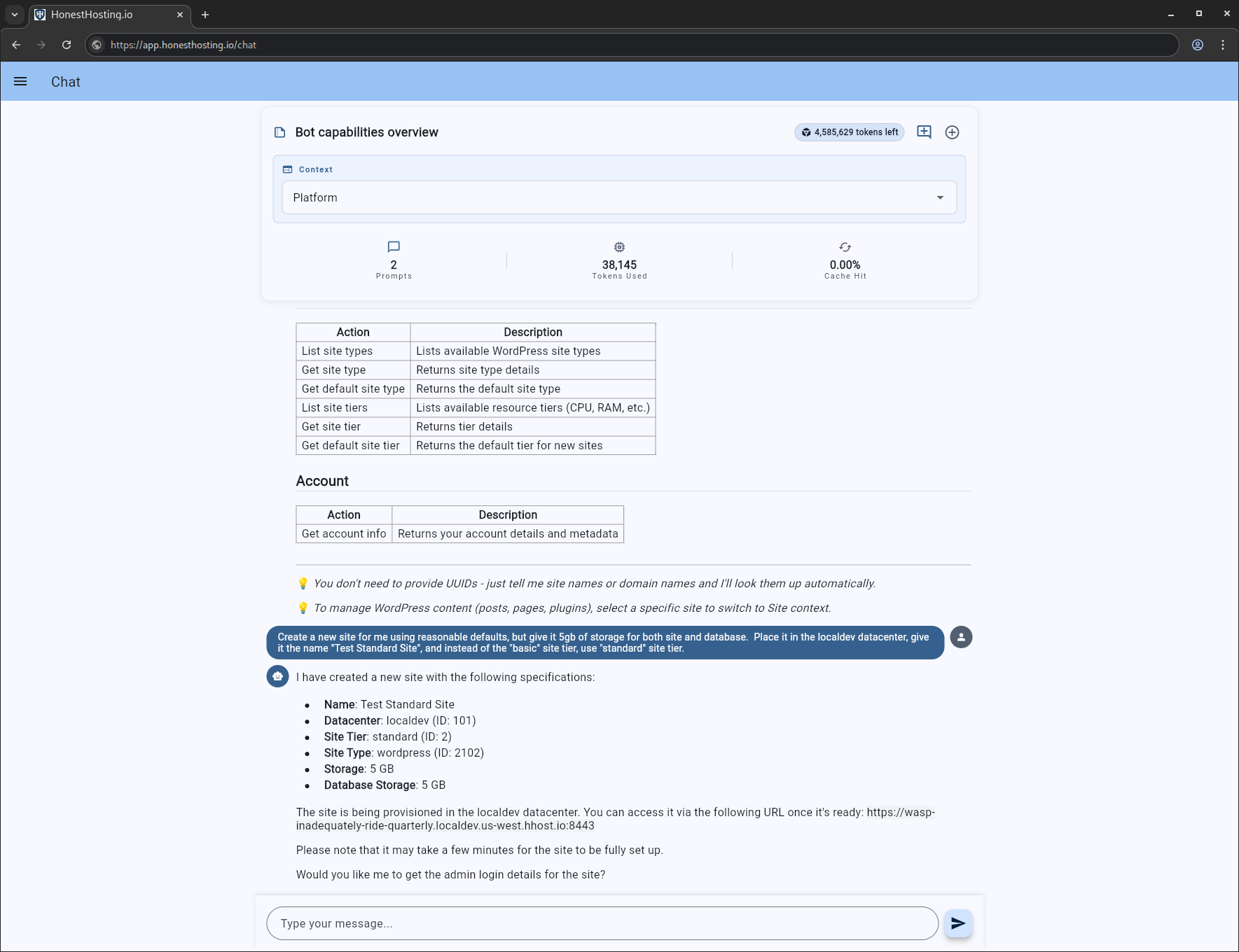 We just created a new site “Test Standard Site”. We are going to switch our context to that site, and have the chatbot tell us what capabilities it has access to: