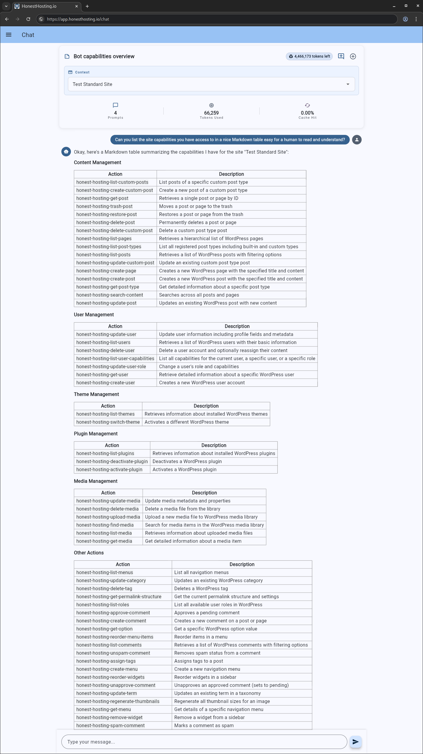 As HonestHosting.io improves the chatbot, the list of capabilities may change and improve over time. This is an example ONLY–your response(s) may be different!