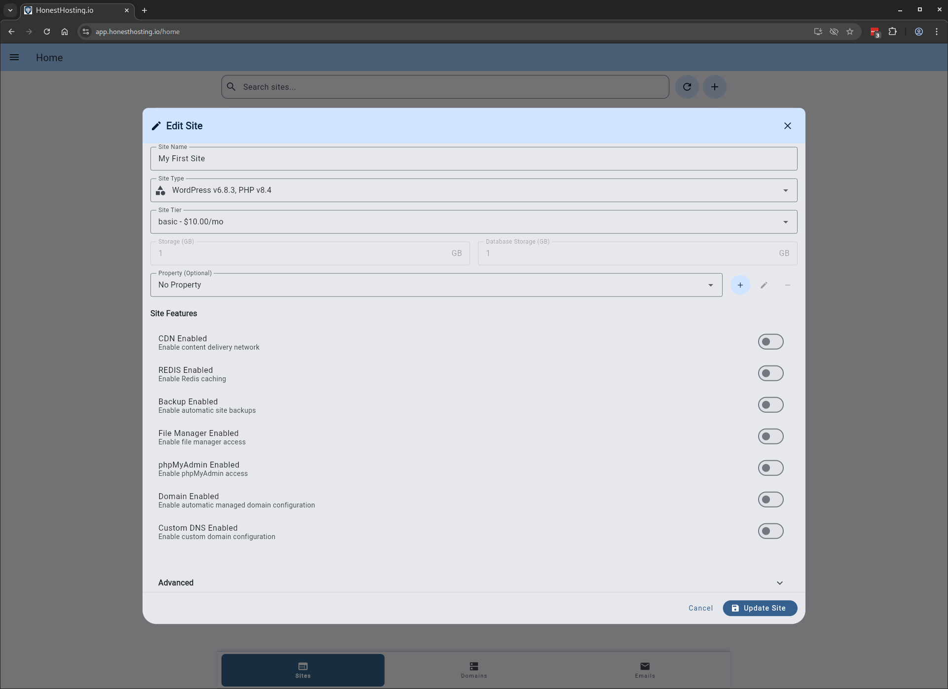 Edit a Site to update it’s deployment include CDN settings, REDIS object cache, CustomDNS, FileManager, and other options.